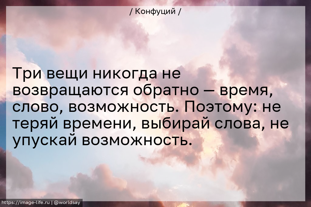 Три вещи никогда не возвращаются обратно — время, слово, возможность. Поэтому: не теряй времени, выбирай слова, не упускай возможность.
