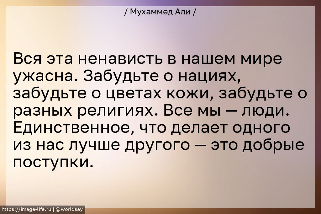 Вся эта ненависть в нашем мире ужасна. Забудьте о нациях, забудьте о цветах кожи, забудьте о разных религиях. Все мы — люди. Единственное, что делает одного из нас лучше другого — это добрые поступки.