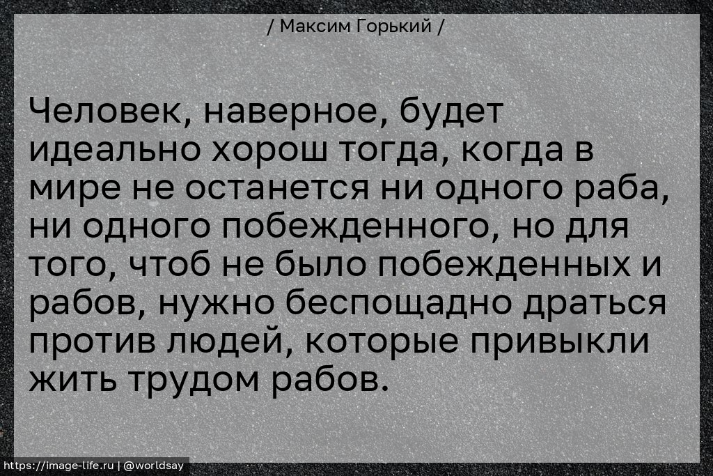 Человек, наверное, будет идеально хорош тогда, когда в мире не останется ни одного раба, ни одного побежденного, но для того, чтоб не было побежденных и рабов, нужно беспощадно драться против людей, которые привыкли жить трудом рабов.