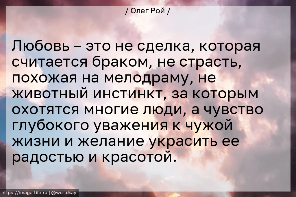 Любовь – это не сделка, которая считается браком, не страсть, похожая на мелодраму, не животный инстинкт, за которым охотятся многие люди, а чувство глубокого уважения к чужой жизни и желание украсить ее радостью и красотой.