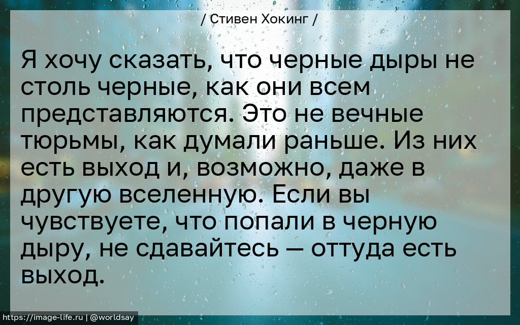 Я хочу сказать, что черные дыры не столь черные, как они всем представляются. Это не вечные тюрьмы, как думали раньше. Из них есть выход и, возможно, даже в другую вселенную. Если вы чувствуете, что попали в черную дыру, не сдавайтесь — оттуда есть выход.