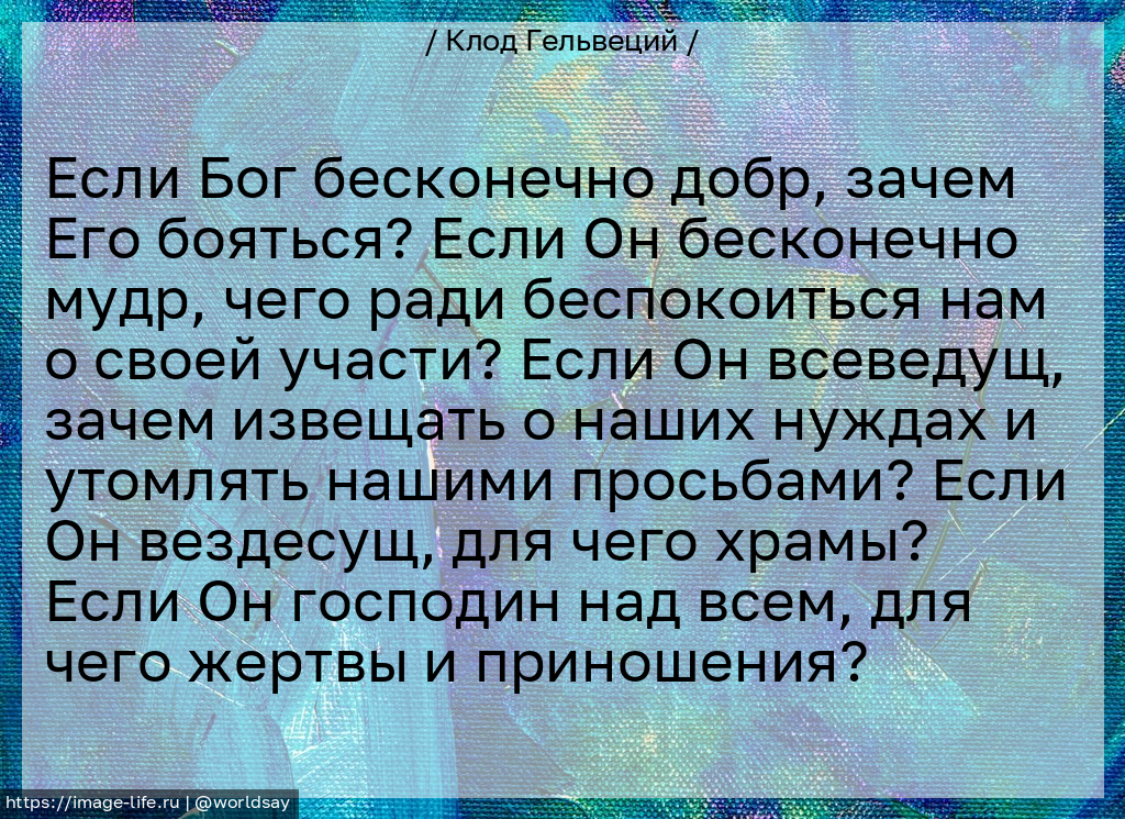 Если Бог бесконечно добр, зачем Его бояться? Если Он бесконечно мудр, чего ради беспокоиться нам о своей участи? Если Он всеведущ, зачем извещать о наших нуждах и утомлять нашими просьбами? Если Он вездесущ, для чего храмы? Если Он господин над всем, для чего жертвы и приношения?