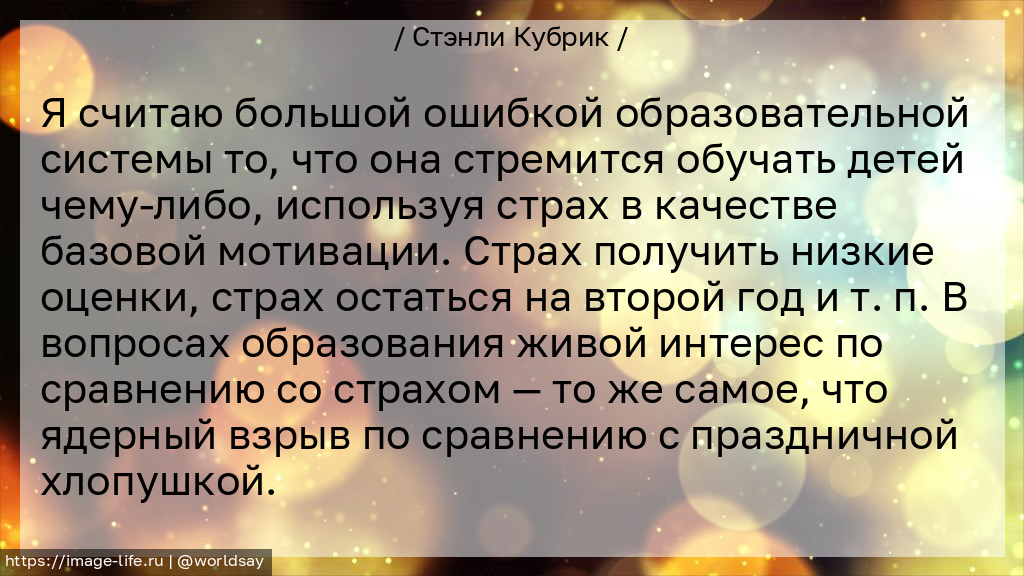 Я считаю большой ошибкой образовательной системы то, что она стремится обучать детей чему-либо, используя страх в качестве базовой мотивации. Страх получить низкие оценки, страх остаться на второй год и т. п. В вопросах образования живой интерес по сравнению со страхом — то же самое, что ядерный взрыв по сравнению с праздничной хлопушкой.