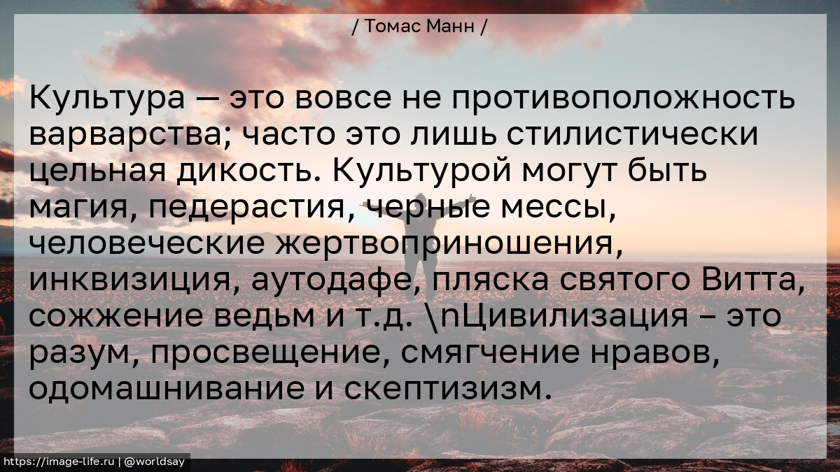 Культура — это вовсе не противоположность варварства; часто это лишь стилистически цельная дикость. Культурой могут быть магия, педерастия, черные мессы, человеческие жертвоприношения, инквизиция, аутодафе, пляска святого Витта, сожжение ведьм и т.д. Цивилизация – это разум, просвещение, смягчение нравов, одомашнивание и скептизизм.