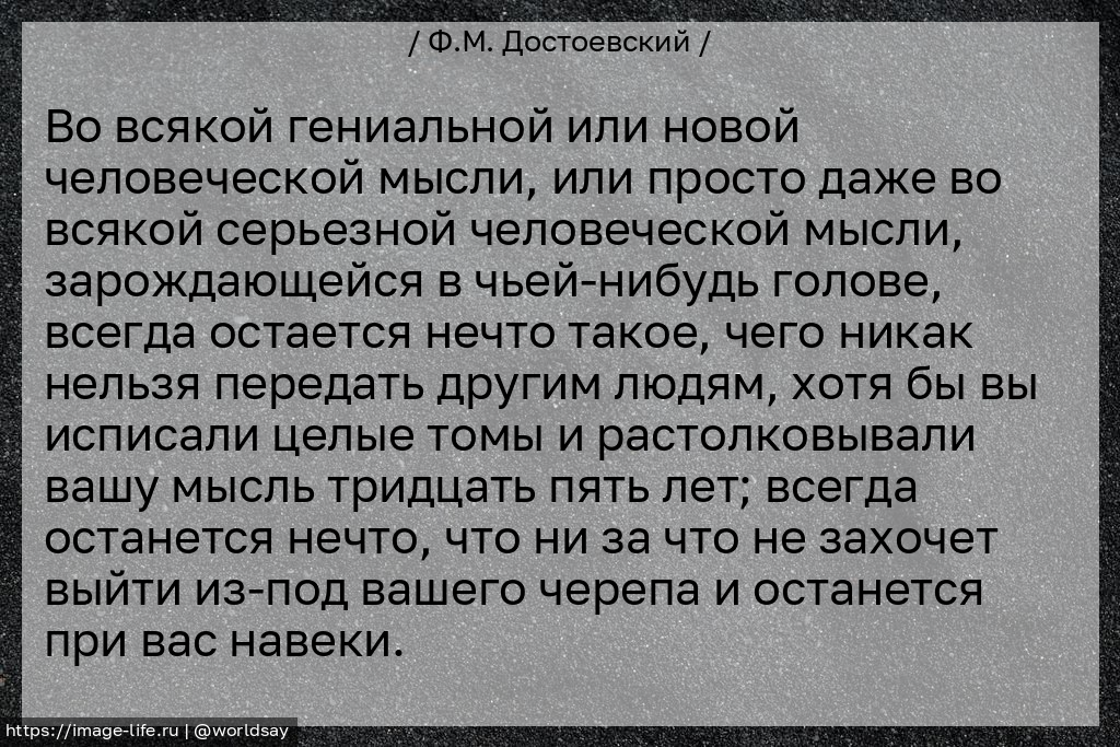 Во всякой гениальной или новой человеческой мысли, или просто даже во всякой серьезной человеческой мысли, зарождающейся в чьей-нибудь голове, всегда остается нечто такое, чего никак нельзя передать другим людям, хотя бы вы исписали целые томы и растолковывали вашу мысль тридцать пять лет; всегда останется нечто, что ни за что не захочет выйти из-под вашего черепа и останется при вас навеки.