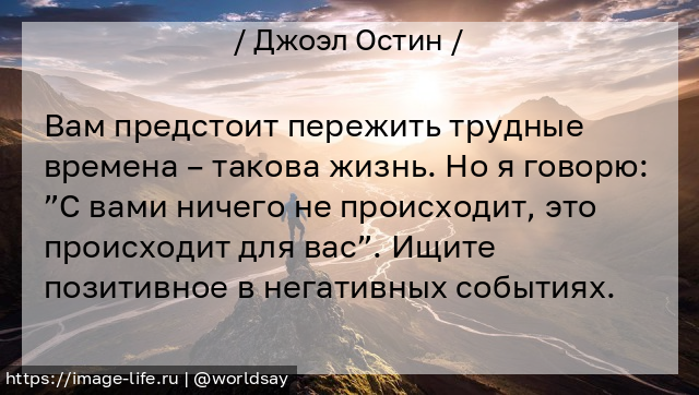 Вам предстоит пережить трудные времена – такова жизнь. Но я говорю: ”С вами ничего не происходит, это происходит для вас”. Ищите позитивное в негативных событиях.