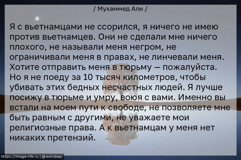 Я с вьетнамцами не ссорился, я ничего не имею против вьетнамцев. Они не сделали мне ничего плохого, не называли меня негром, не ограничивали меня в правах, не линчевали меня. Хотите отправить меня в тюрьму — пожалуйста. Но я не поеду за 10 тысяч километров, чтобы убивать этих бедных несчастных людей. Я лучше посижу в тюрьме и умру, воюя с вами. Именно вы встали на моем пути к свободе, не позволяете мне быть равным с другими, не уважаете мои религиозные права. А к вьетнамцам у меня нет никаких претензий.