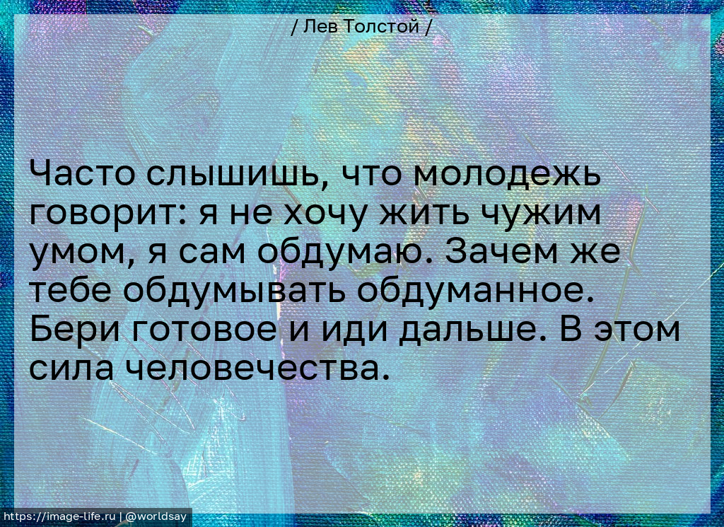 Часто слышишь, что молодежь говорит: я не хочу жить чужим умом, я сам обдумаю. Зачем же тебе обдумывать обдуманное. Бери готовое и иди дальше. В этом сила человечества.