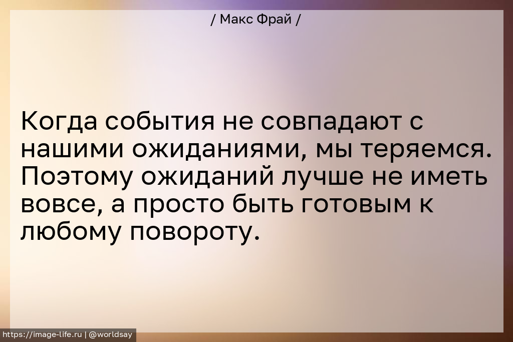 Когда события не совпадают с нашими ожиданиями, мы теряемся. Поэтому ожиданий лучше не иметь вовсе, а просто быть готовым к любому повороту.