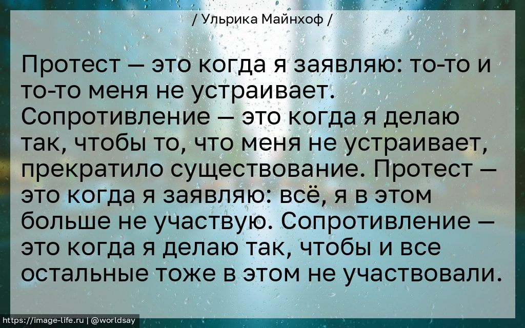 Протест — это когда я заявляю: то-то и то-то меня не устраивает. Сопротивление — это когда я делаю так, чтобы то, что меня не устраивает, прекратило существование. Протест — это когда я заявляю: всё, я в этом больше не участвую. Сопротивление — это когда я делаю так, чтобы и все остальные тоже в этом не участвовали.