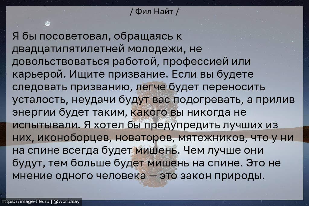 Я бы посоветовал, обращаясь к двадцатипятилетней молодежи, не довольствоваться работой, профессией или карьерой. Ищите призвание. Если вы будете следовать призванию, легче будет переносить усталость, неудачи будут вас подогревать, а прилив энергии будет таким, какого вы никогда не испытывали. Я хотел бы предупредить лучших из них, иконоборцев, новаторов, мятежников, что у ни на спине всегда будет мишень. Чем лучше они будут, тем больше будет мишень на спине. Это не мнение одного человека — это закон природы.